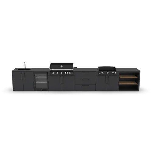 Sestavte si venkovní kuchyni přesně podle svých představ – náš modulární systém vám dává naprostou volnost v uspořádání a konfiguraci. Můžete si vybrat z široké škály komponentů, od různých typů grilů a chladniček, až po dřez s vodovodní baterií a variabilní úložné skříňky. Zvolit si můžete i materiál madel, barvu skříněk, provedení zadní stěny a především odstín pracovní desky z elegantního kamene.